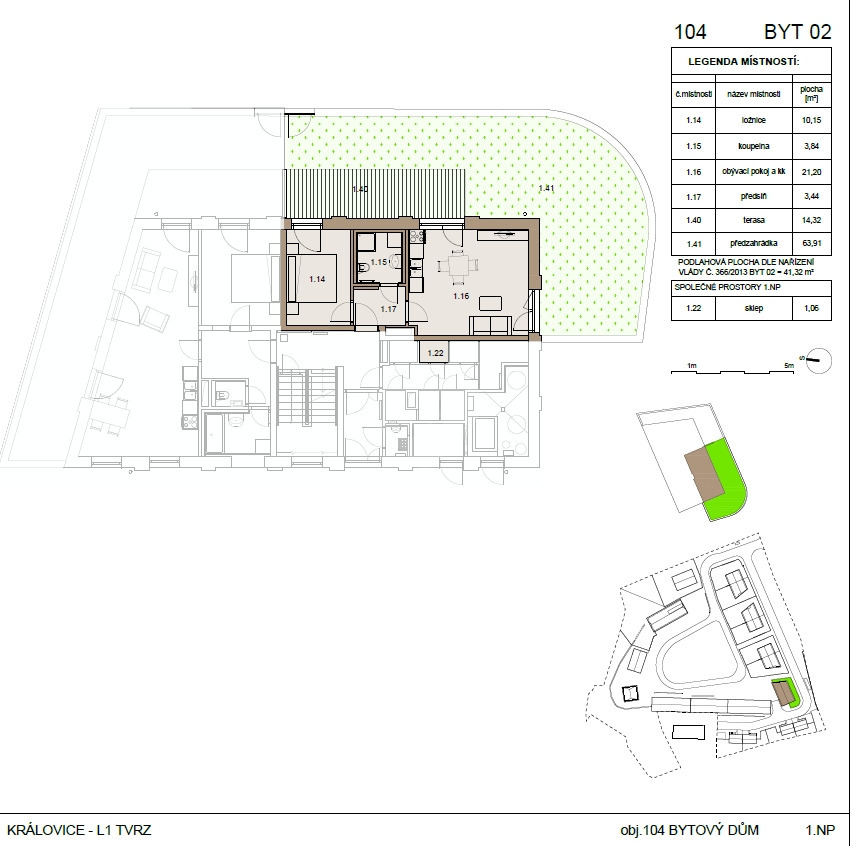 Ve výhradním zastoupení vlastníka nemovitosti vám nabízím k dlouhodobému pronájmu nový a moderní byt (41.3 m2) s terasou (14.2 m2) a vlastní předzahrádkou o ploše 63.91 m2, který se nachází v 1. nadzemním podlaží rezidenčního bytového domu v areálu projektu Nové Královice. Byt je vybaven kuchyňskou linkou se sklokeramickou indukční deskou a el. troubou, digestoří a lednicí s mrazákem. Byly zde použity výlučně velmi kvalitní materiály a provedení je opravdu precizní. Dřevěné podlahy, velkoformátová dlažba, hliníková okna s izolačními trojskly, předokenní žaluzie atd. K bytu dále náleží sklep a vlastní parkovací stání u domu - zahrnuto v ceně. Projekt se nachází v městské části Praha-Královice, která si zachovala původní vesnický ráz, ale současně je velmi dobře propojena s centrem města. Obec tak představuje klidnější a čistší variantu městského života. Přímo v Královicích naleznete množství sportovního vyžití i možností pro trávení volného času: tenisové kurty, fotbalové hřiště, přírodní park v údolí Rokytky, přírodní koupaliště Markéta, turistickou trasu i síť cyklostezek napojených na trasy vedoucí do Prahy, do Běchovic atd. V sousedním areálu zrekonstruované historické tvrze najdete např. i vyhlášenou restauraci Markéta. Jestliže hledáte lokalitu zrozenou k nalezení klidu a zároveň v místě plné občanské vybavenosti, jste v Královicích správně. Pronajímatel požaduje vratnou kauci ve výši 50.000 Kč, odměna RK 1 nájemné + DPH. Doporučuji vám osobní prohlídku. Byt bude k nastěhování po dohodě se stávajícím nájemcem cca do dvou měsíců.